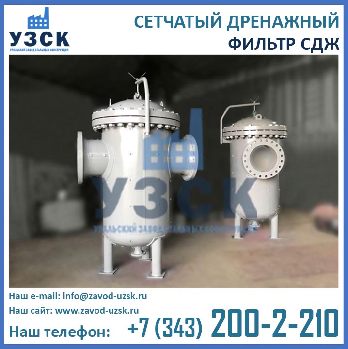 На формирование цены дренажного фильтра влияют следующие факторы: материальное исполнение, конструктивное исполнение, стоимость сырья в момент изготовления, комплектация, необходимость доставки в другой населенный пункт, срочность выполнения работ по изготовлению, прочие предпочтения заказчика. Уральский завод стальных конструкций изготавливает фильтры СДЖ-700 любого типового исполнения, а также нестандартные фильтры СДЖ 700 мм по чертежам заказчика или техническому заданию. Дополнительно к фильтрам СДЖ у нас Вы можете заказать сменные фильтрующие элементы любой тонкости фильтрации, ответные фланцы, прокладки и крепеж. По запросу изготавливаем также фильтры СДЖ-К-700 с концевым затвором. Для того чтобы узнать какова цена на фильтр СДЖ Ду700 в Семее с необходимыми Вам характеристиками, отправьте запрос в отдел продаж завода УЗСК по координатам, указанным в разделе «Контакты».